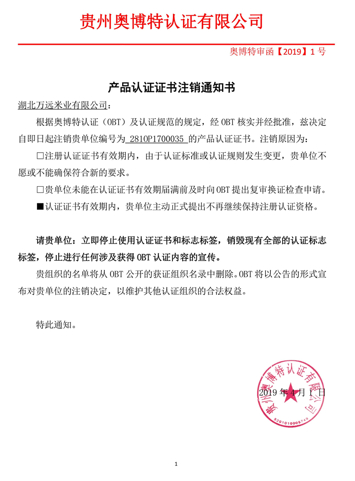 注銷湖北萬遠米業有限公司產品認證證書通知