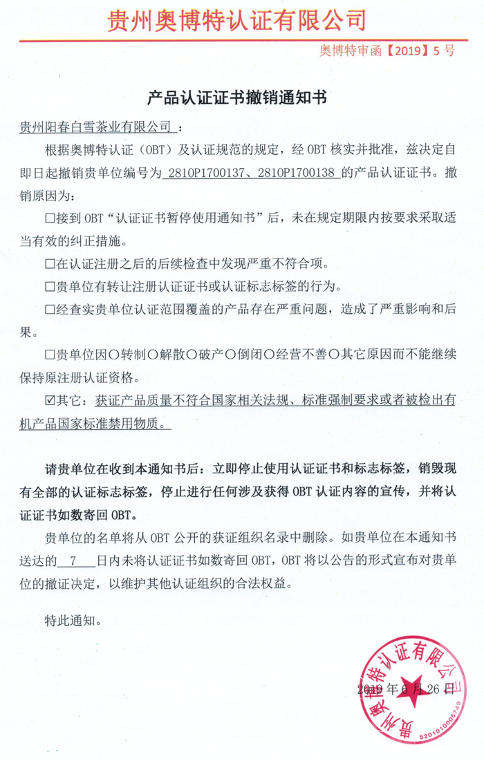 撤銷貴州陽春白雪茶業(yè)有限公司產(chǎn)品認(rèn)證證書通知