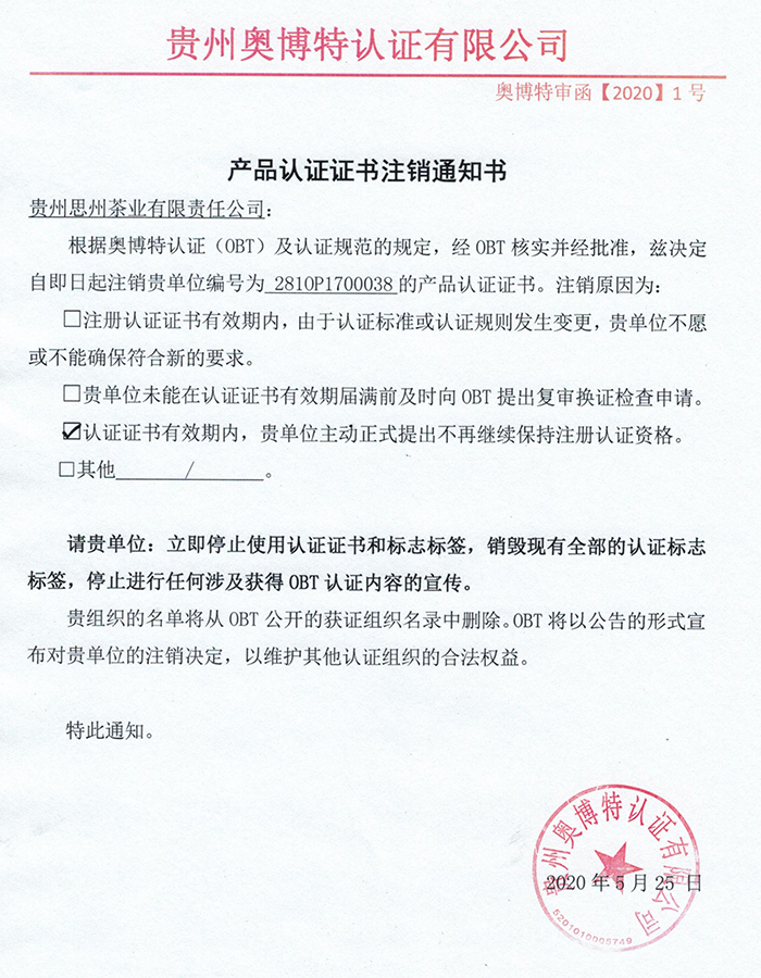 注銷貴州思州茶業(yè)有限責(zé)任公司產(chǎn)品認(rèn)證證書通知