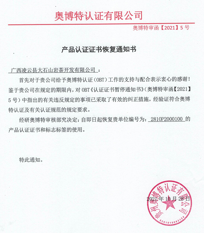恢復廣西凌云縣大石山巖茶開發(fā)有限公司產(chǎn)品認證證書通知