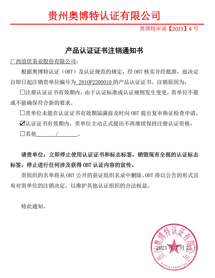注銷廣西浪伏茶業股份有限公司產品認證證書通知