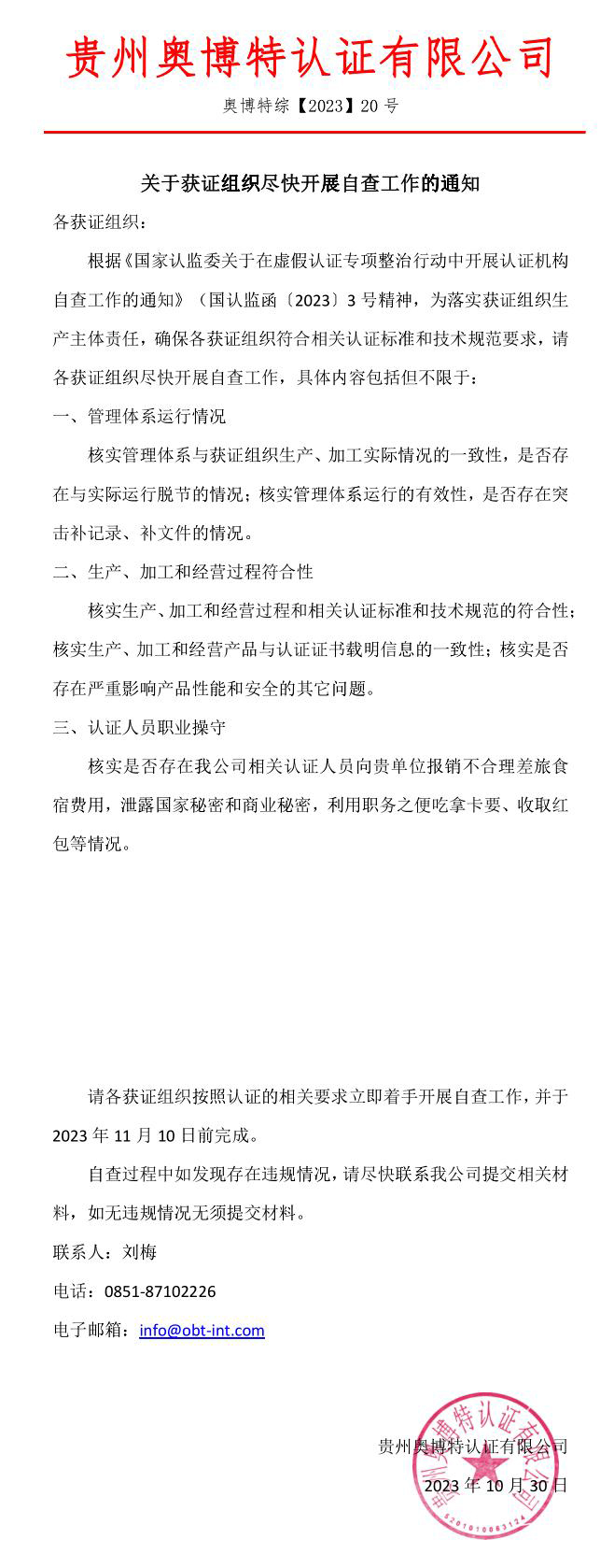 關于獲證組織盡快開展自查工作的通知