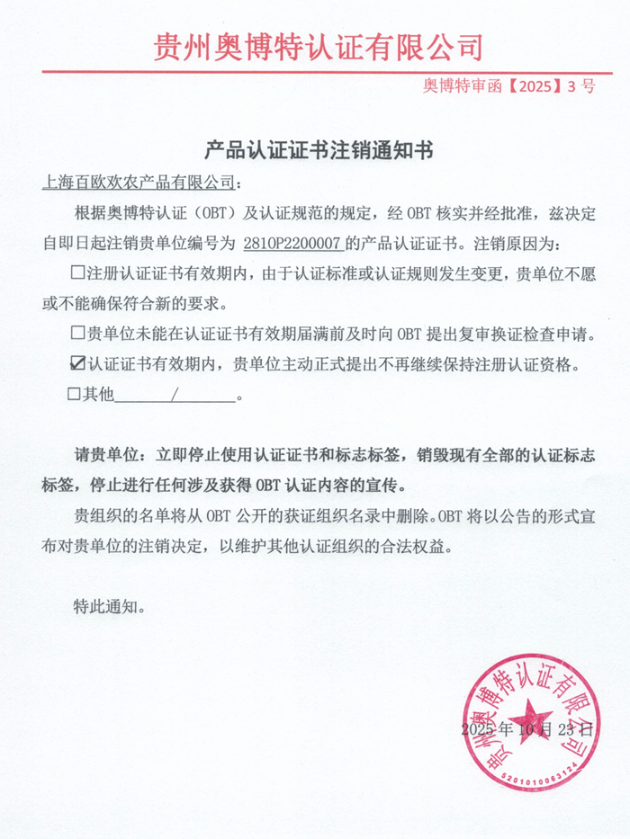 注銷上海百歐歡農產品有限公司產品認證證書通知