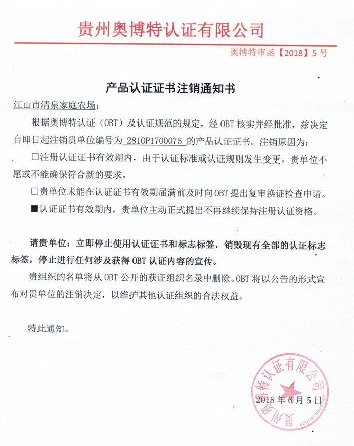 注銷江山市清泉家庭農場產品認證證書通知